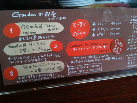 日替わりの「今日のお昼ごはん(16:00まで)」は700円です。ひとつひとつお作りしています。その他に夜の定番メニュー「タコライス」と「ビーフカレー」もお出ししています。