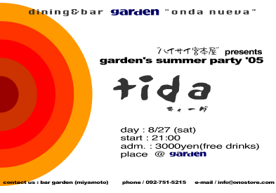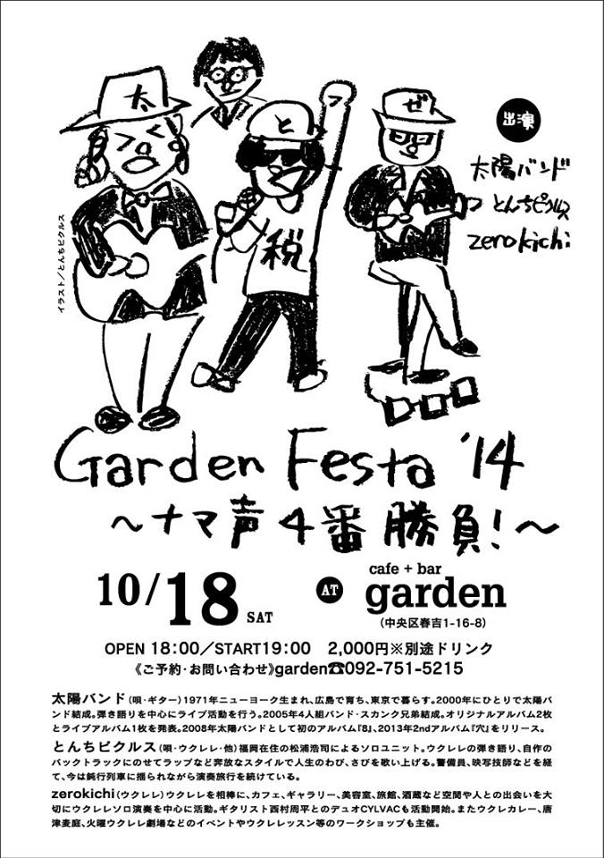 久しぶりのイベントです!! 太陽バンドの来福という事で とんちピクルスさんとzerokichiさんと いっしょに企画してくれました! unplugedでキャンプファイヤーのように盛り上がりましょう!! ご予約はお早めに。 garden 092-751-5215 |